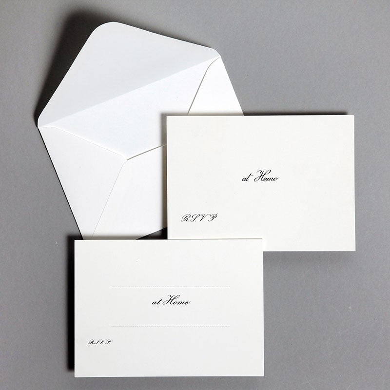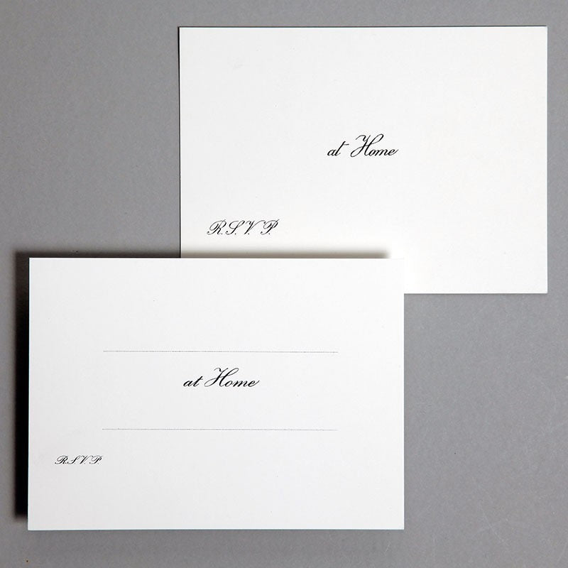 These luxurious blank at Home Invitations are printed in an elegant script font, in black thermography (raised ink), on thick, smooth 600gsm card. Available in either white or ivory, with the option of adding leaders, they make perfect invitations for any party or event at home. Includes 50 cards (measuring 110 x 152mm) with matching envelopes.