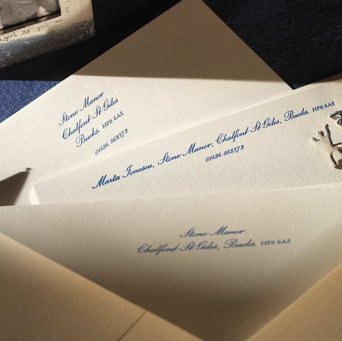 Correspondence cards are printed on quality card. All cards are available in either wove (smooth) or laid (textured) finish. Printing can be flat or raised (thermographic).