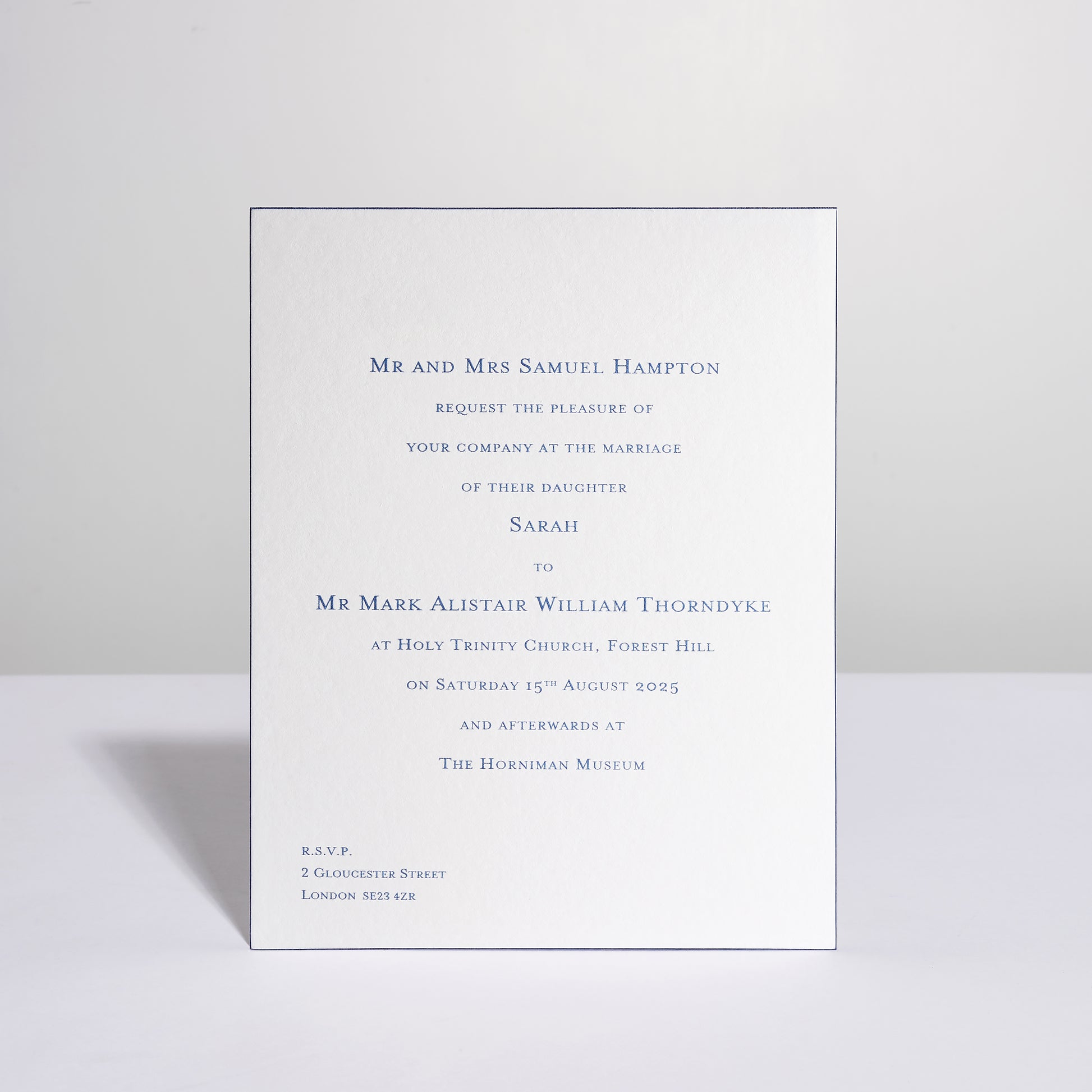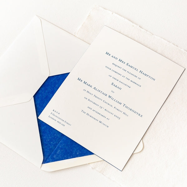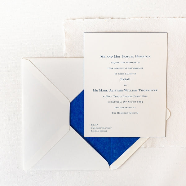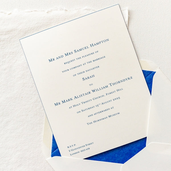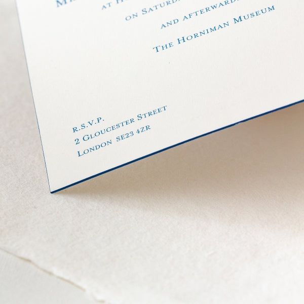 The bevelled edge of the Invitation, in matching ink to the text, adds a luxurious look and feel. The colour of the Airforce Blue ink is subtle and very elegant. The typeface is Gee Mrs Eaves.