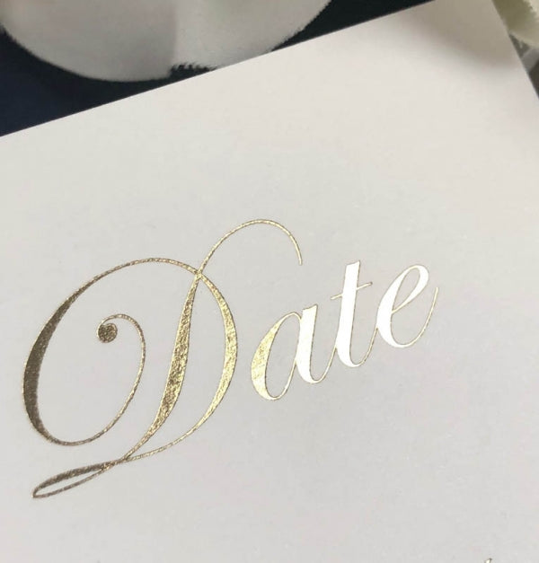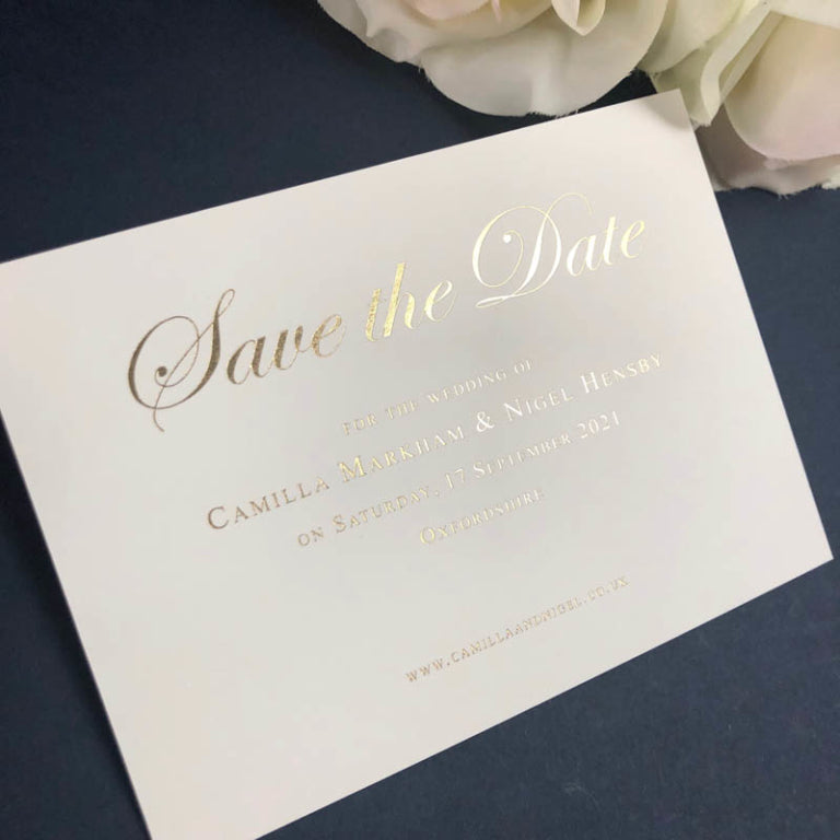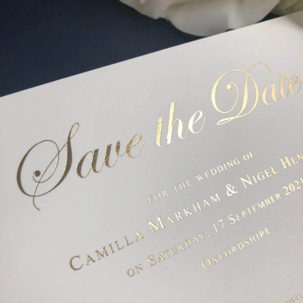 GB Gloss Gold Save the Date is a stunning invitation; foiled in gloss gold on ivory 400gsm card in elegant Edwardian Script and Times New Roman typefaces.