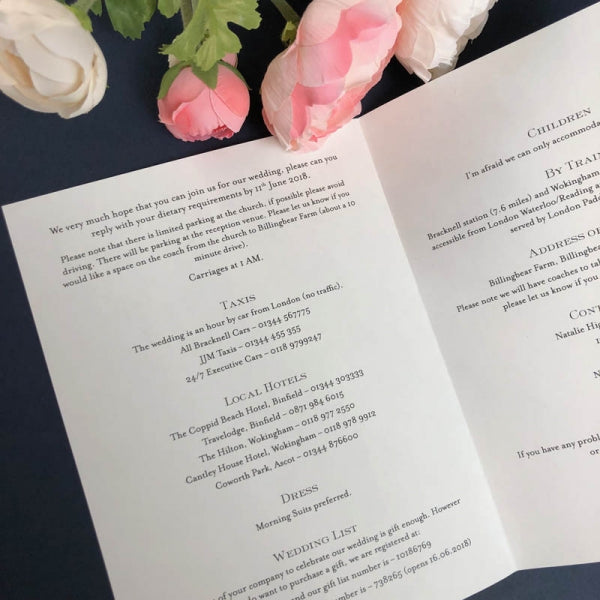 Details to consider: travel and transport, accommodation, taxis, contacts for the day, dietary requirements, children (yes or no), wedding list, directions (including a map), car parking, timings for the day/weekend, dress code, venues.