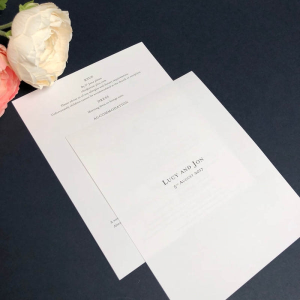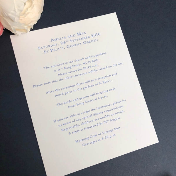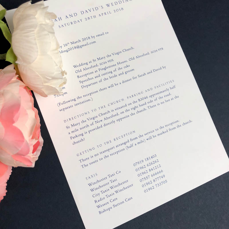 There are a number of steps to consider: the font colour and style, paper/card colour and whether you need to include a map (this will need to be uploaded separately and the sales team will be in touch if it incurs an extra cost).