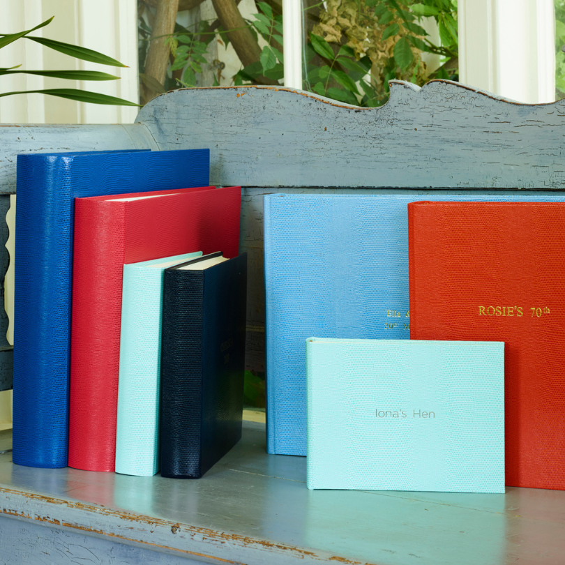 The Noble Macmillan Jubilee collection is made from embossed card with ‘lizard’ print detail which is a beautiful and long-lasting alternative to real leather. Each album is bound in their UK workshop. This album has cream pages, hand-stitched spines, head and tail bands, and is available in a range of colours. The albums can be personalised with a name, date or message in silver or gold leaf. These personalised albums make an excellent and thoughtful gift for any occasion.