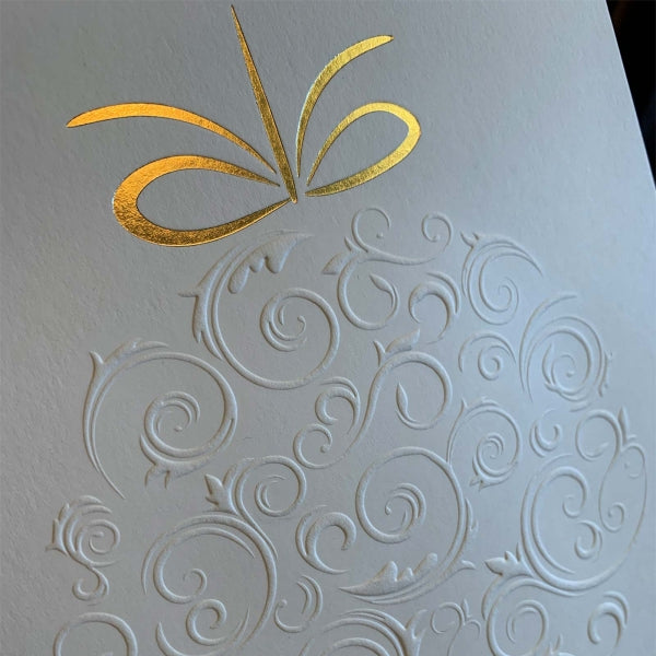 These luxurious cards feature an intricate bauble design. They are printed using a combination of fine blind-embossing and hand-pressed foil, on thick white card. Our luxury Christmas card range showcases skilled traditional print processes and makes for stand out cards to send to your loved ones this year.
