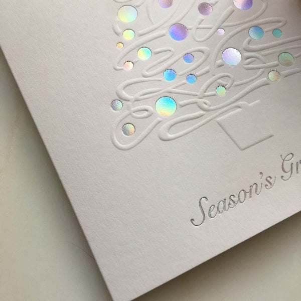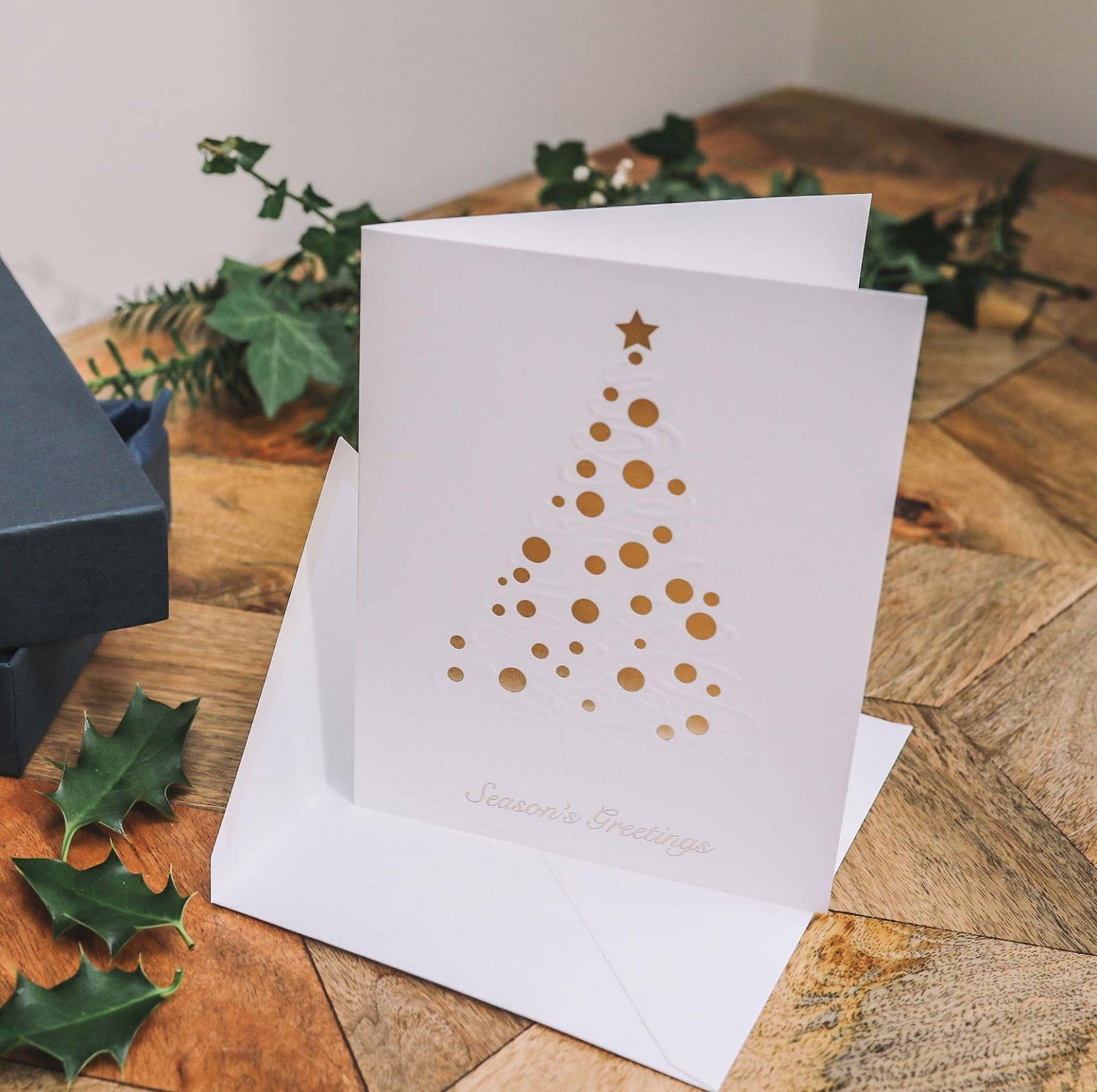 These luxurious large cards feature an elegant Christmas tree design and are printed using a combination of fine blind-embossing and hand-pressed gold foil. These are printed on a thick white card. Our luxury Christmas card range showcases skilled traditional print processes and makes for stand out cards to send to your loved ones this year.