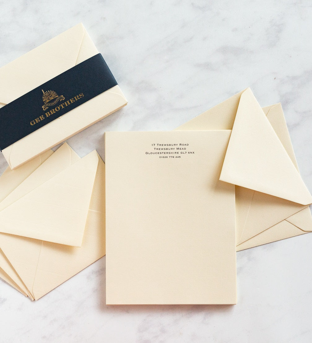 You can choose an option from a range of typefaces, ink colours, paper colours and print finishes to create your perfect writing paper.