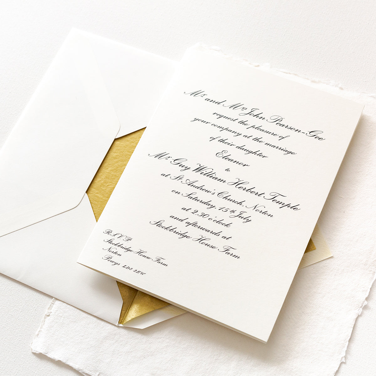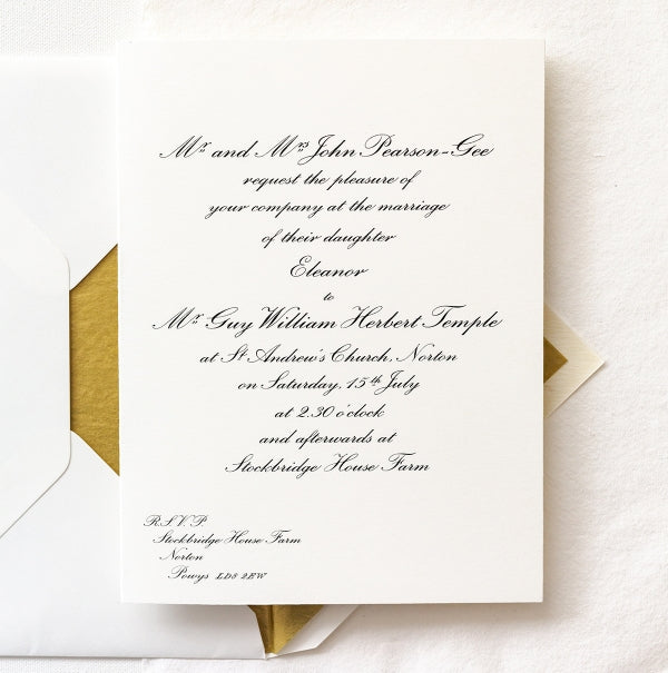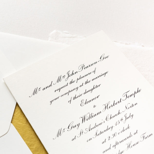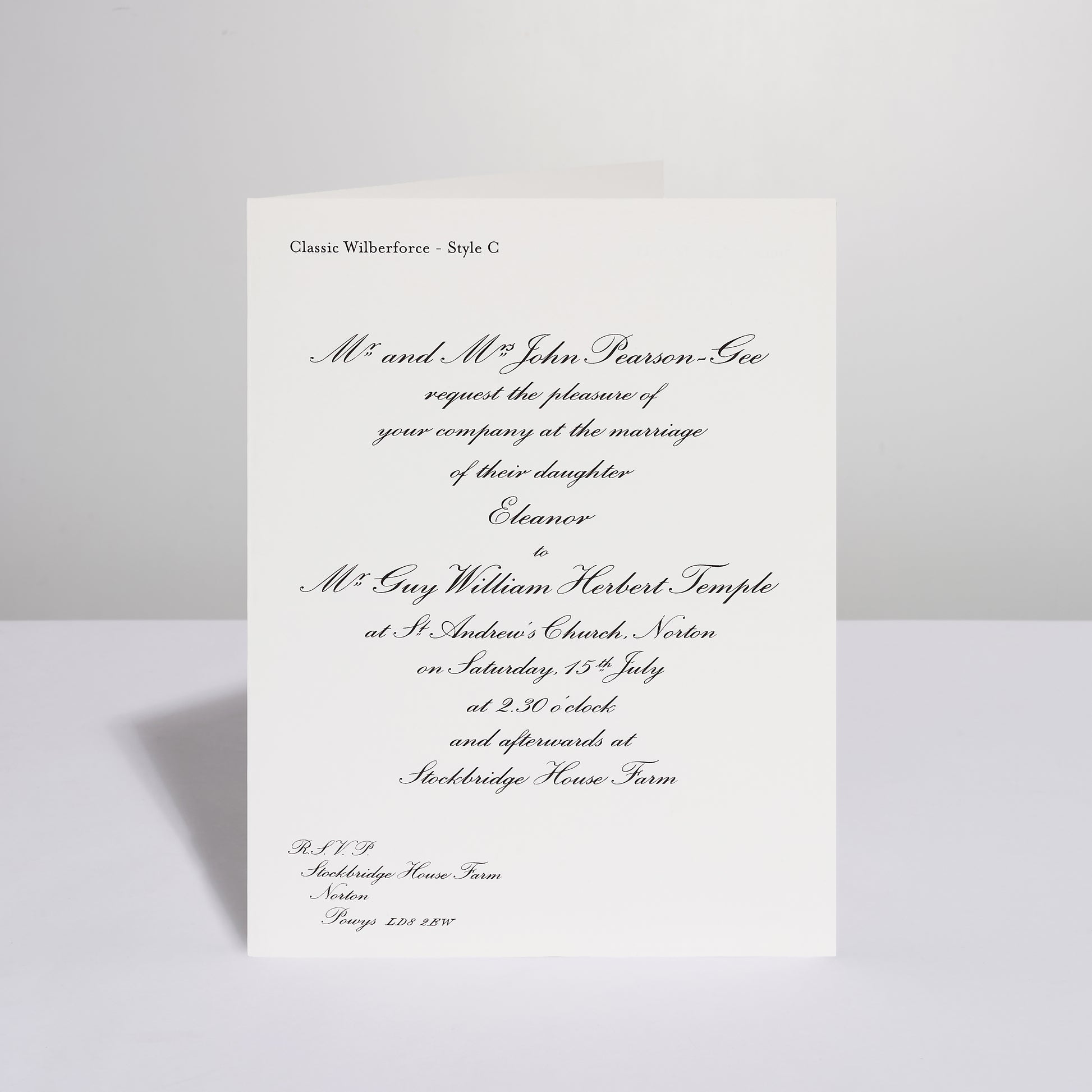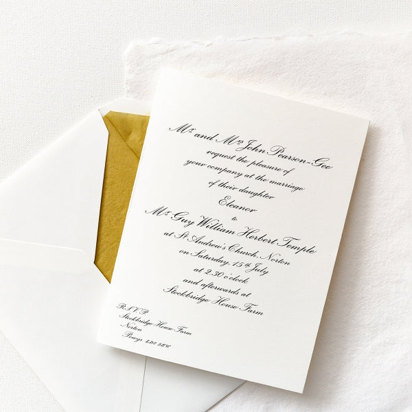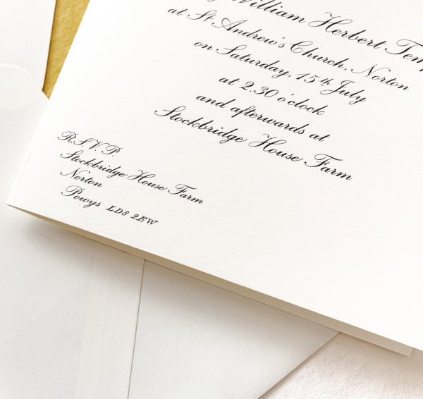 Our Classic Wilberforce folded wedding invitations are our most popular invitations, with an elegant script font and embossed print. This is a classic invitation that will never go out of style.